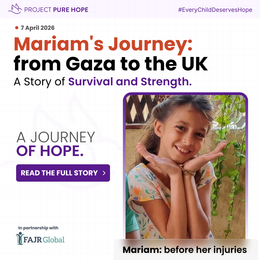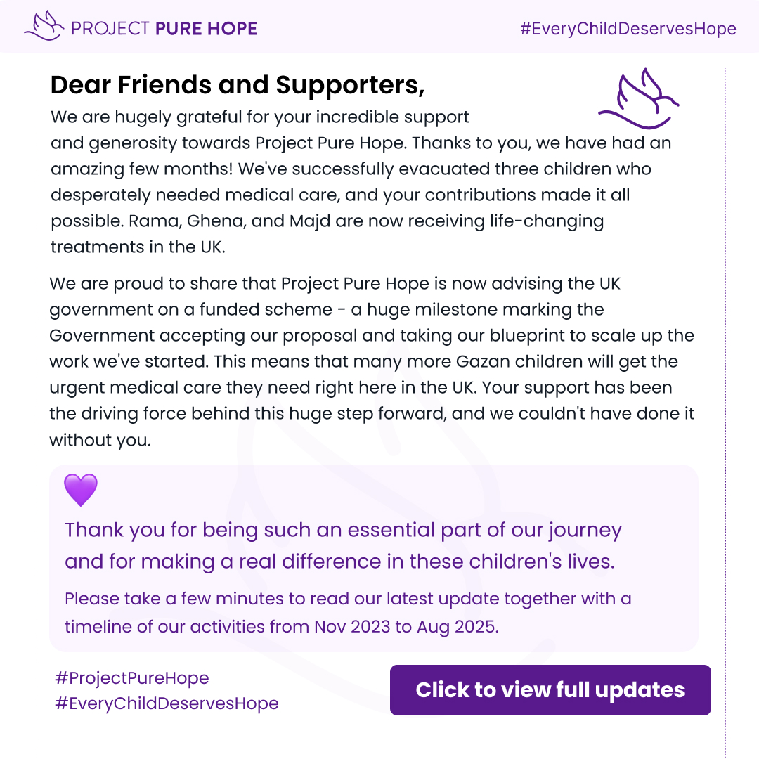 We are proud to share that Project Pure Hope is now advising the UK Government on a funded scheme - a huge milestone marking the Government accepting our proposal and taking our blueprint to scale up the work we've started. This means that many more Gazan children will get the urgent medical care they need right here in the UK. Your support has been the driving force behind this huge step forward, and we couldn't have done it without you.